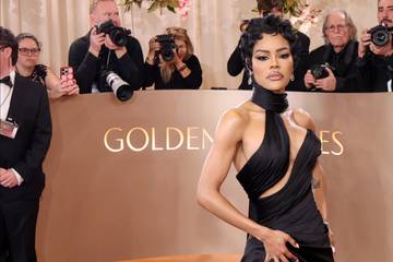Teyana Taylor, a winner for her searing turn as a leftist revolutionary in hotly-tipped film "One Battle After Another," scorched the carpet in a cut-out backless black Schiaparelli gown with a halter neckline -- and a cheeky crystal bow on her backside.