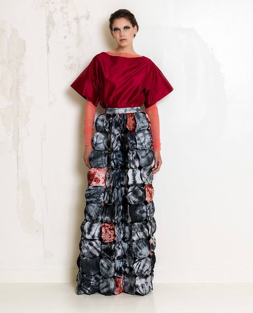 Unable to source his usual fabrics made in other countries, he created his pared-back collection “from nothing” utilising scraps of fabric from previous collections and orders, which he explains were “destined for the garbage”.