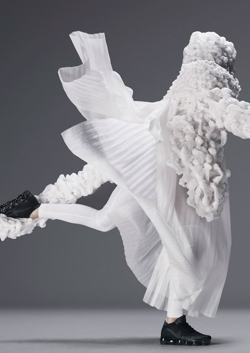 "Visually it may seem hard, but touching the VaporMax gives a completely different feeling. My dress is meant to provide the same effect, which looks like a solid sculpture. But it is, in fact, very light and flexible, allowing the body to easily move with the garment.