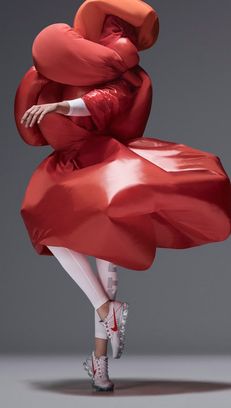 "I chose a subtle monochromatic palette of red and orange so that the focus remained on the structure of the garment and the VaporMax. The fabrics chosen are of different qualities of nylons, and the knotted drapes are padded with wadding to give an inflated effect."