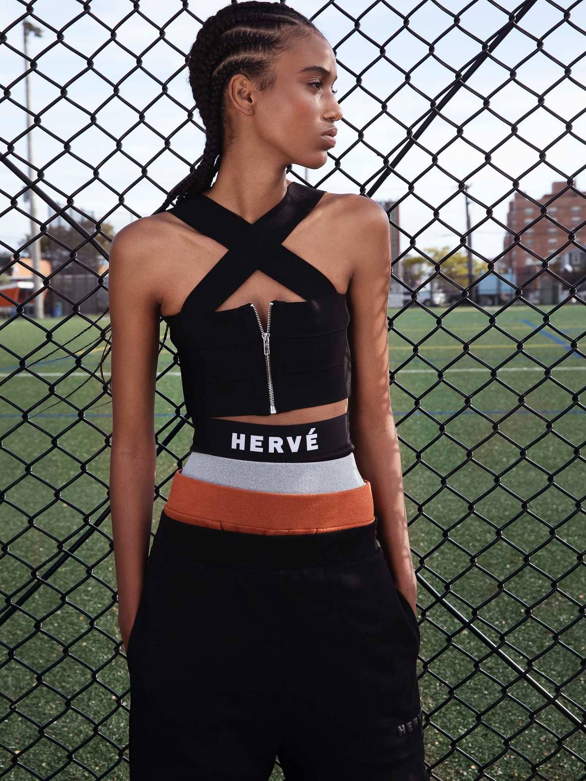 Hervé by Hervé Léger includes a range of bodysuits, sweatshirts, bandage tees, leggings, bike shorts, dresses and oversized jackets, created with comfort and ease of movement in mind.
