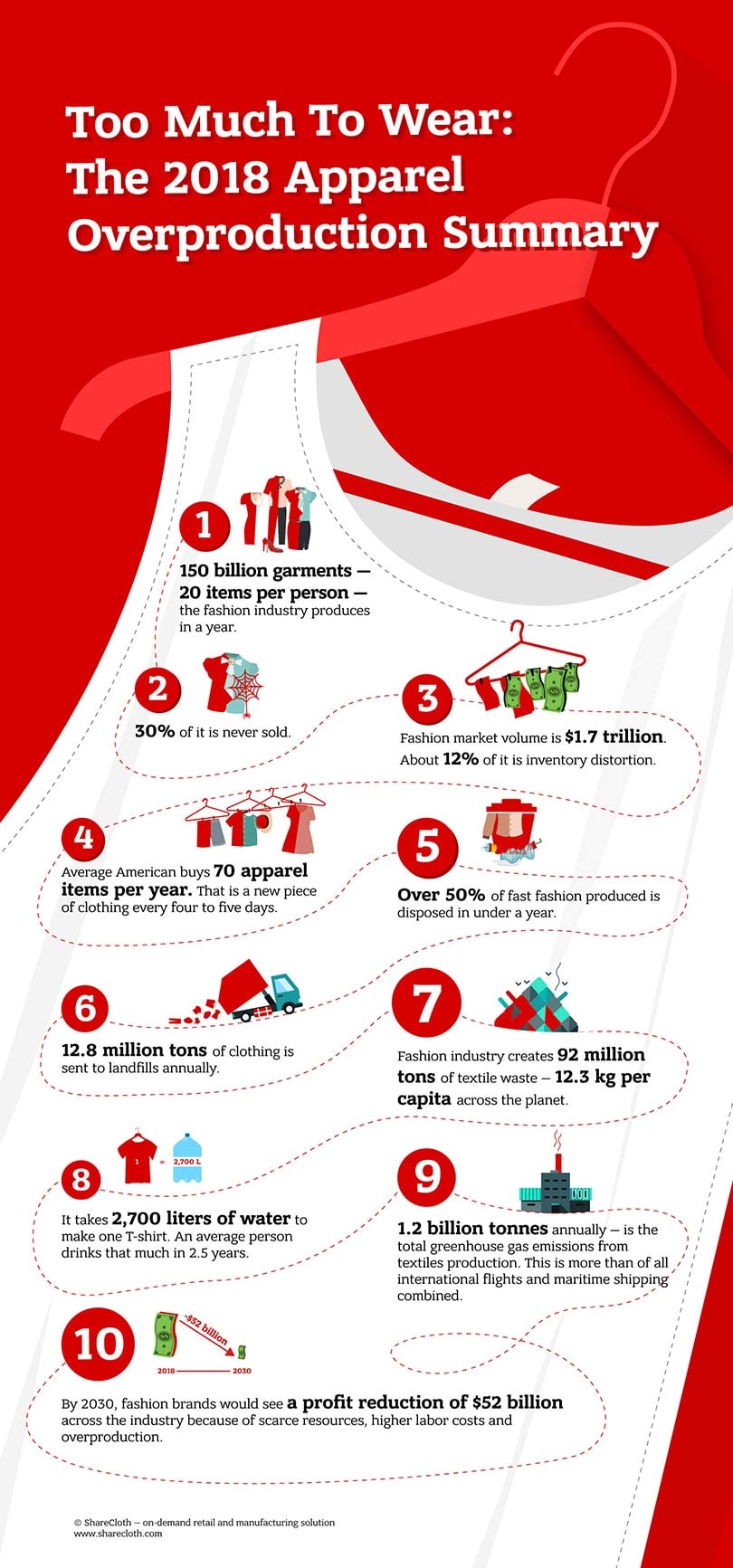 ShareCloth, a cloud-based platform to connect fashion retailers and manufacturers allowing for on-demand production, has taken a closer look at the latest research and reports on the issue. That resulted in an infographic revealing the extent of overproduction in the apparel industry, which the company kindly shared with FashionUnited.