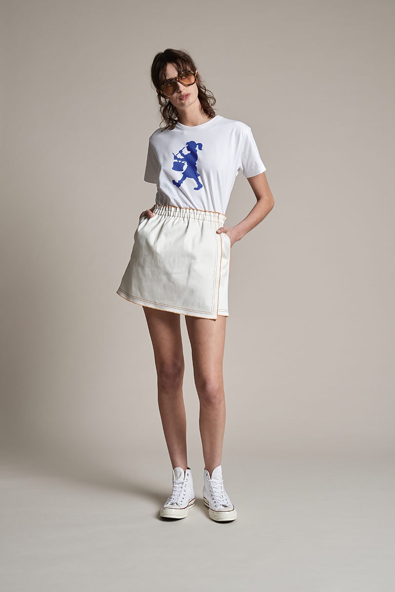 The pieces in the Karen Walker x Outland Denim capsule include cropped flare style the Sage Jean, a wrapped mini skirt called the Rhythm Skirt and the Goldie Jacket, which was inspired by the classic worker’s jacket. These styles are all crafted from off-white denim that is made from organic cotton, staying true to Outland Denim's commitment to using only sustainably-produced cotton.