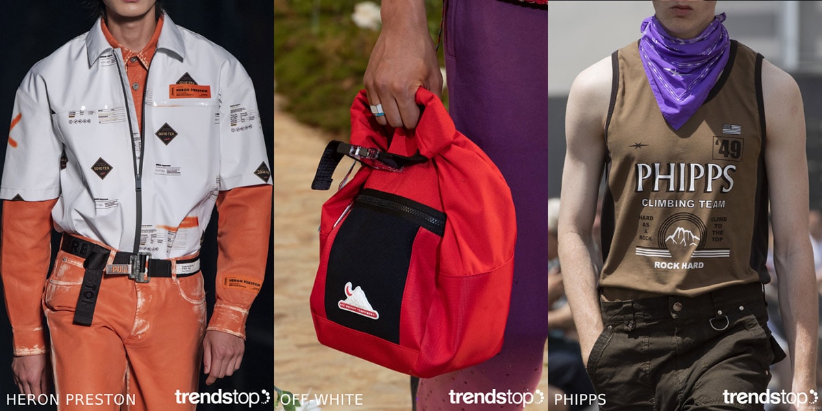 Placement graphics take inspiration from outdoor brands and their motifs to channel a performance aesthetic. Mountain renderings and climbing references imbue apparel and accessories with an extreme sports feel while functional components and branded materials are referenced via visible label prints.