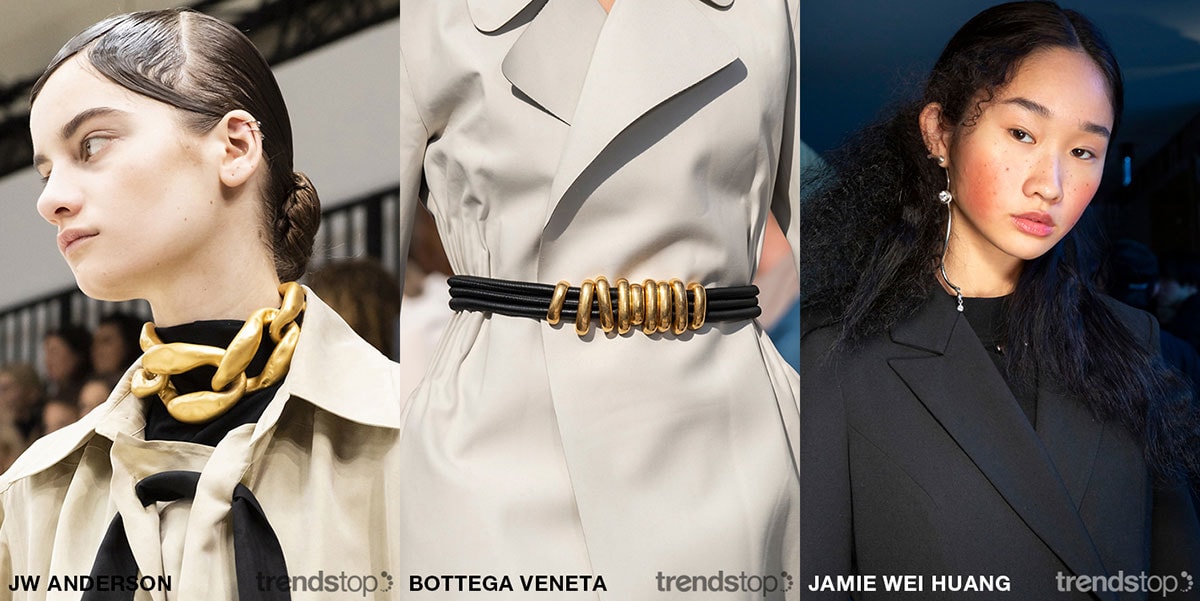 Futuristic metalwork is given a fresh, organic twist for softer look. Oversized chunky chains have a subtly beaten finish with semi-matte finishes tempering hard metal constructions. Mixed scale hardware trims introduce an asymmetrical element while single statement earrings utilise flowing lines and curves, echoing forms from nature.