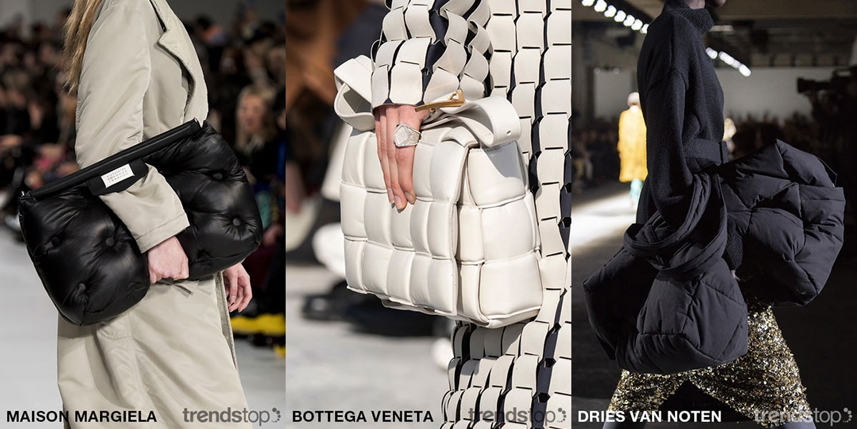 Bags come with a super cosy feel for the winter season. Padding and quilting effects create comforting pieces designed to be grabbed and hugged close to the body. Leathers and materials focus on quality with matte or subtly polished finishes and plush handles. Single colours and minimal hardware highlight 3D surface techniques.