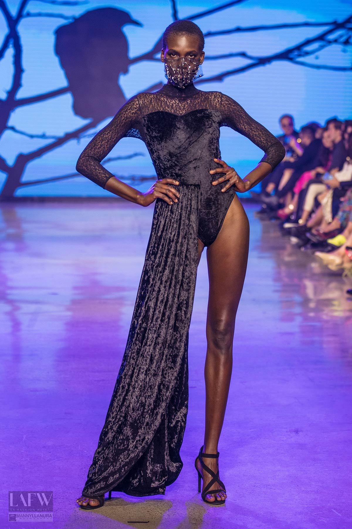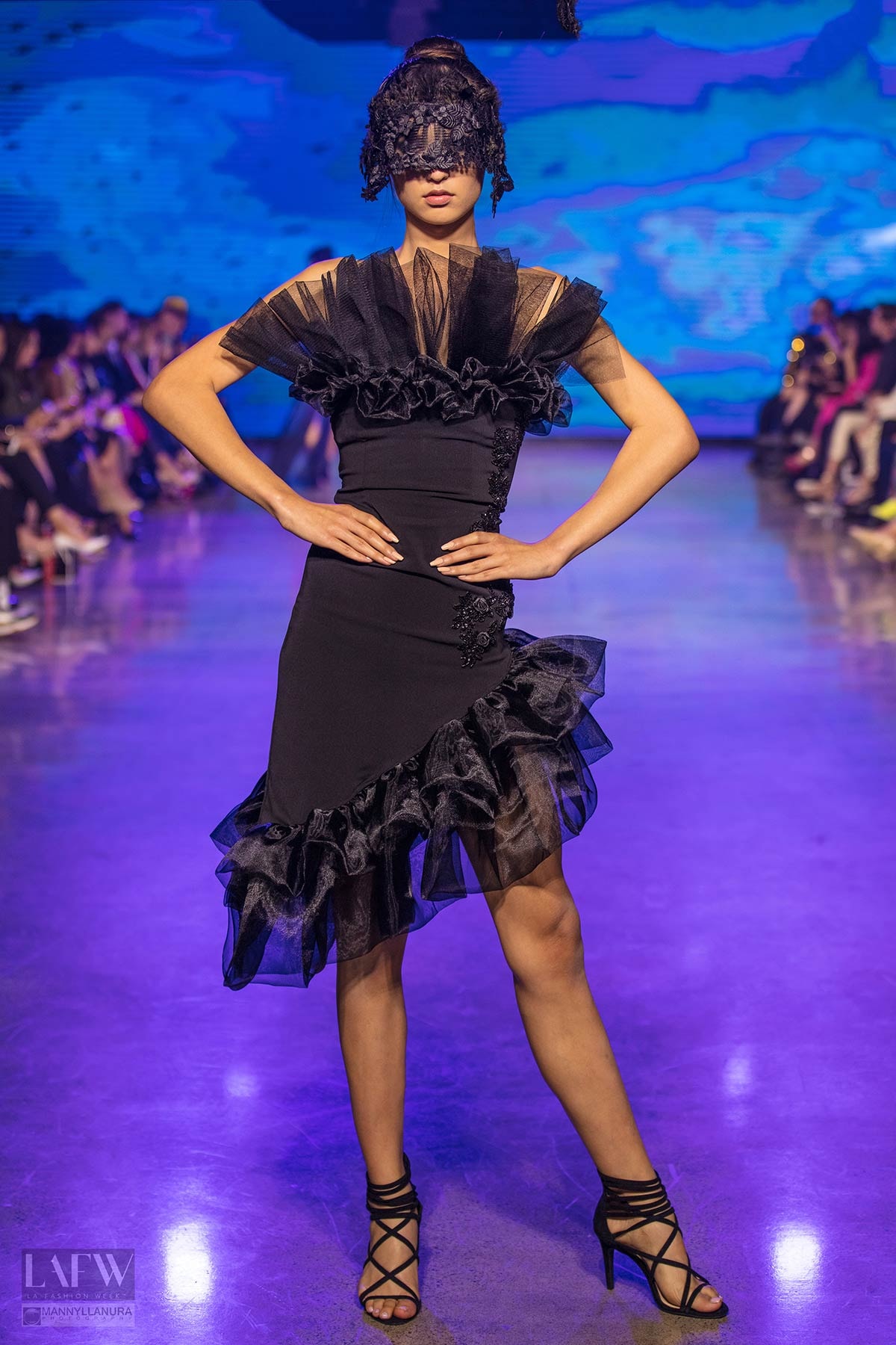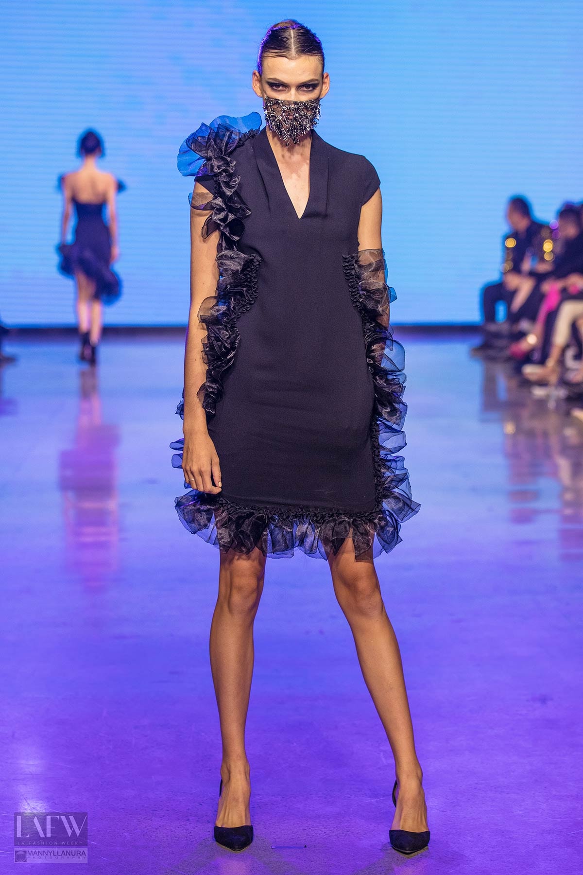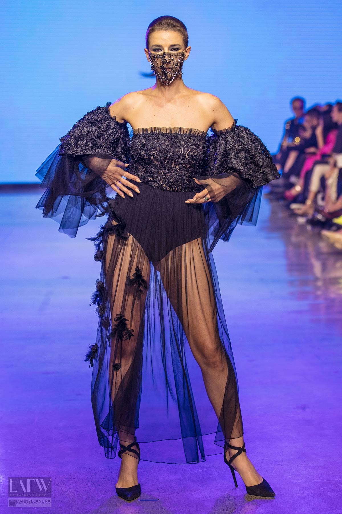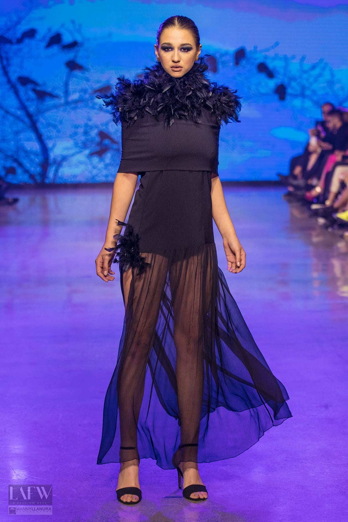 Farinaz Farzaneh made her Los Angeles Fashion Week debut at the Petersen Automotive Museum on Friday, Oct. 11. The designer presented a collection of dark and elegant evening wear. With a range of dresses, jumpsuits, and rompers, the designer focused on embellishments such as feathers, mesh detailing, and lace to add tough femininity to each piece. The designer also added a personal touch to her show, sharing the finale with her mother.