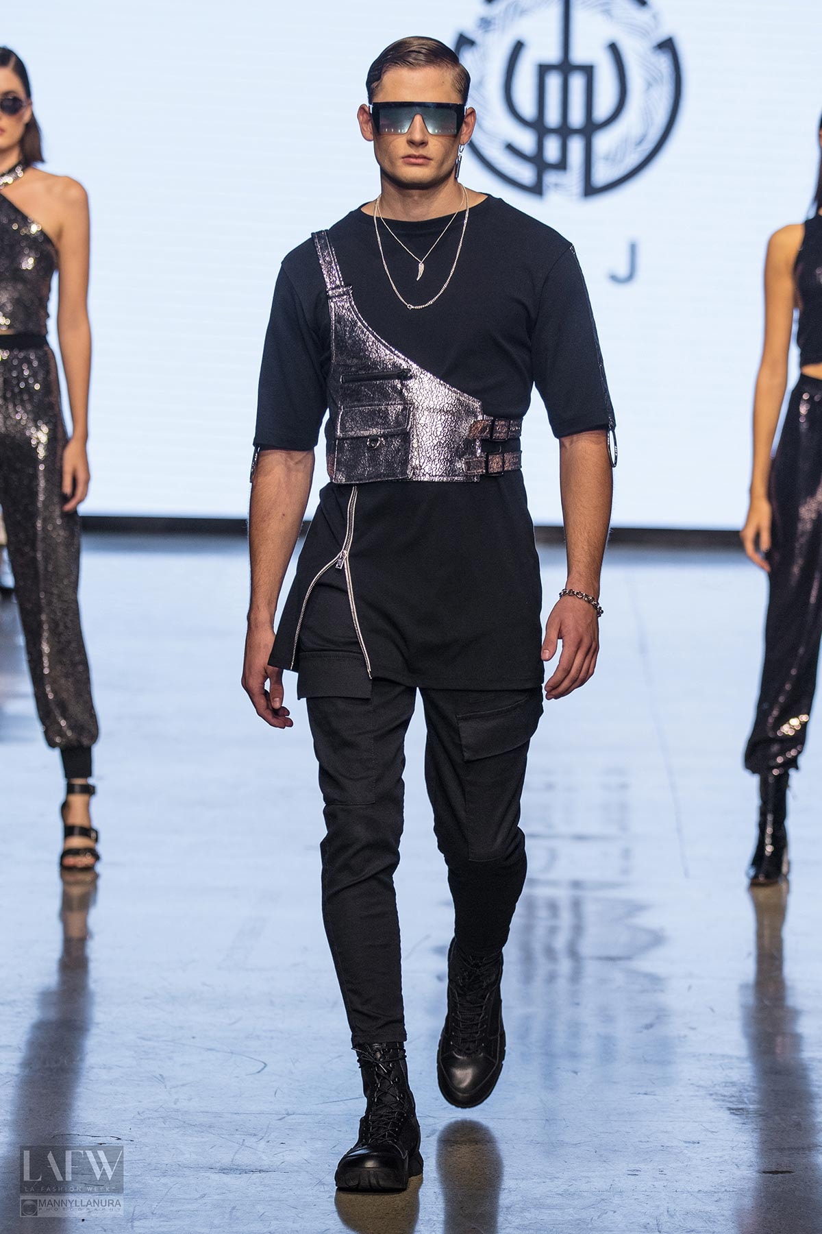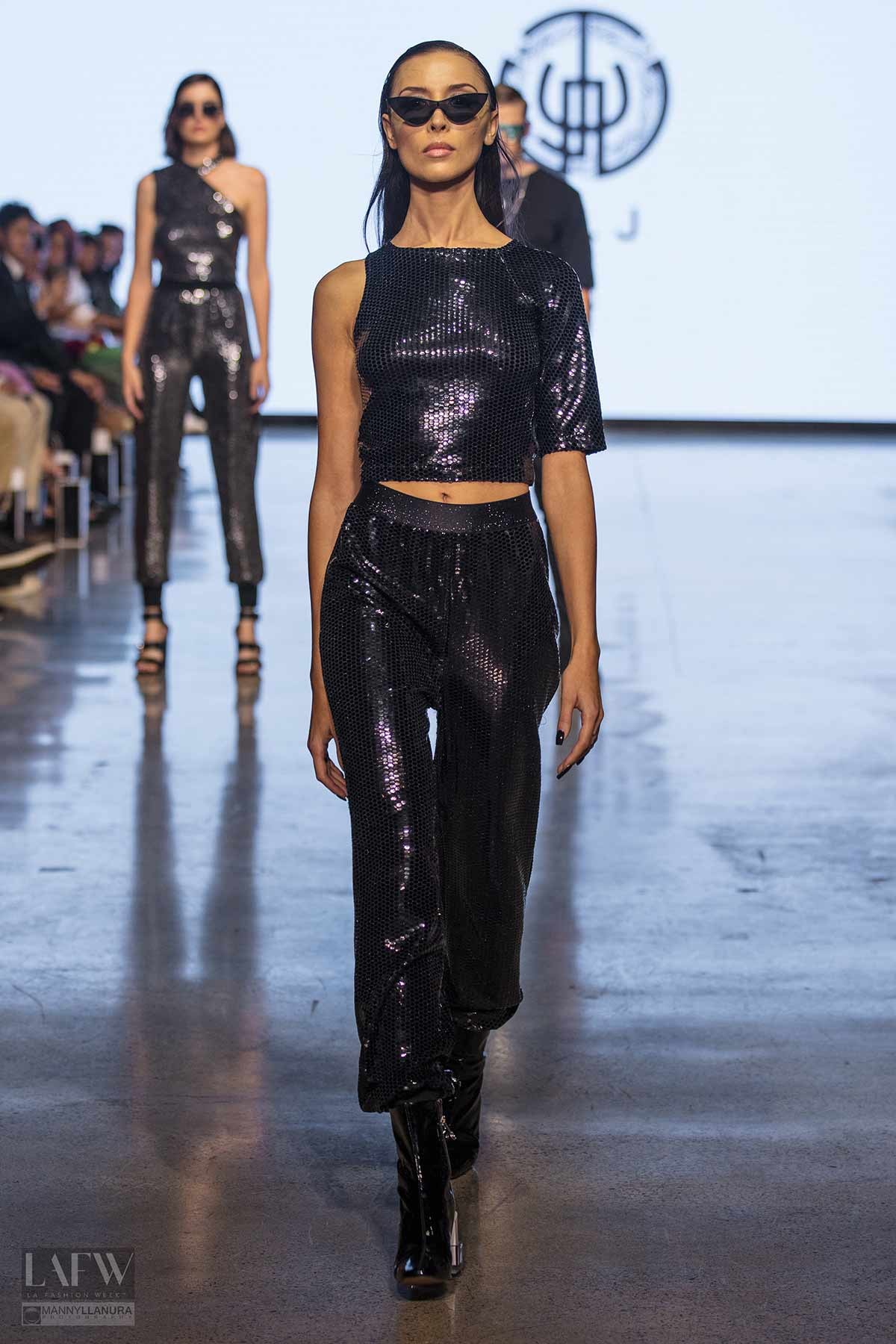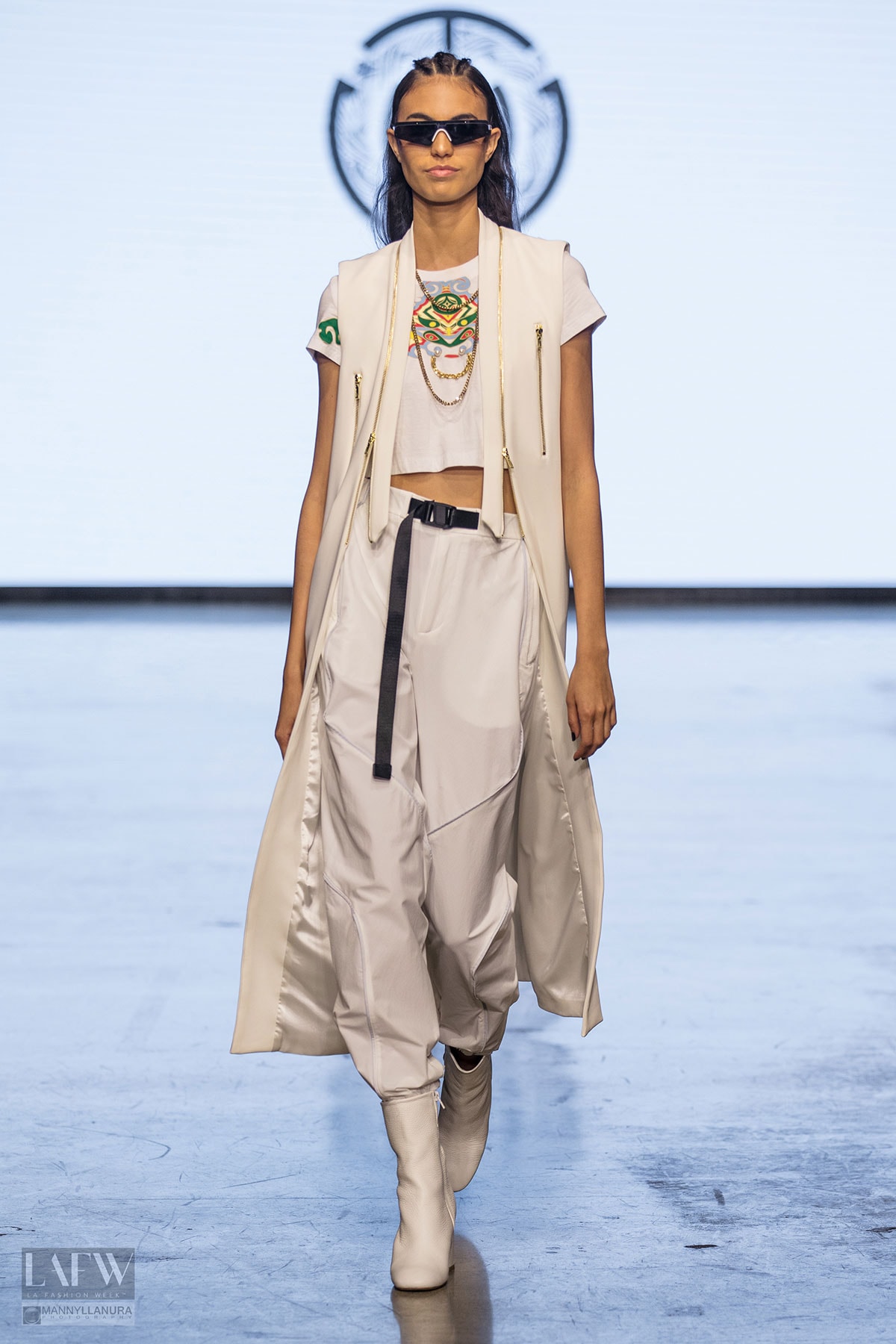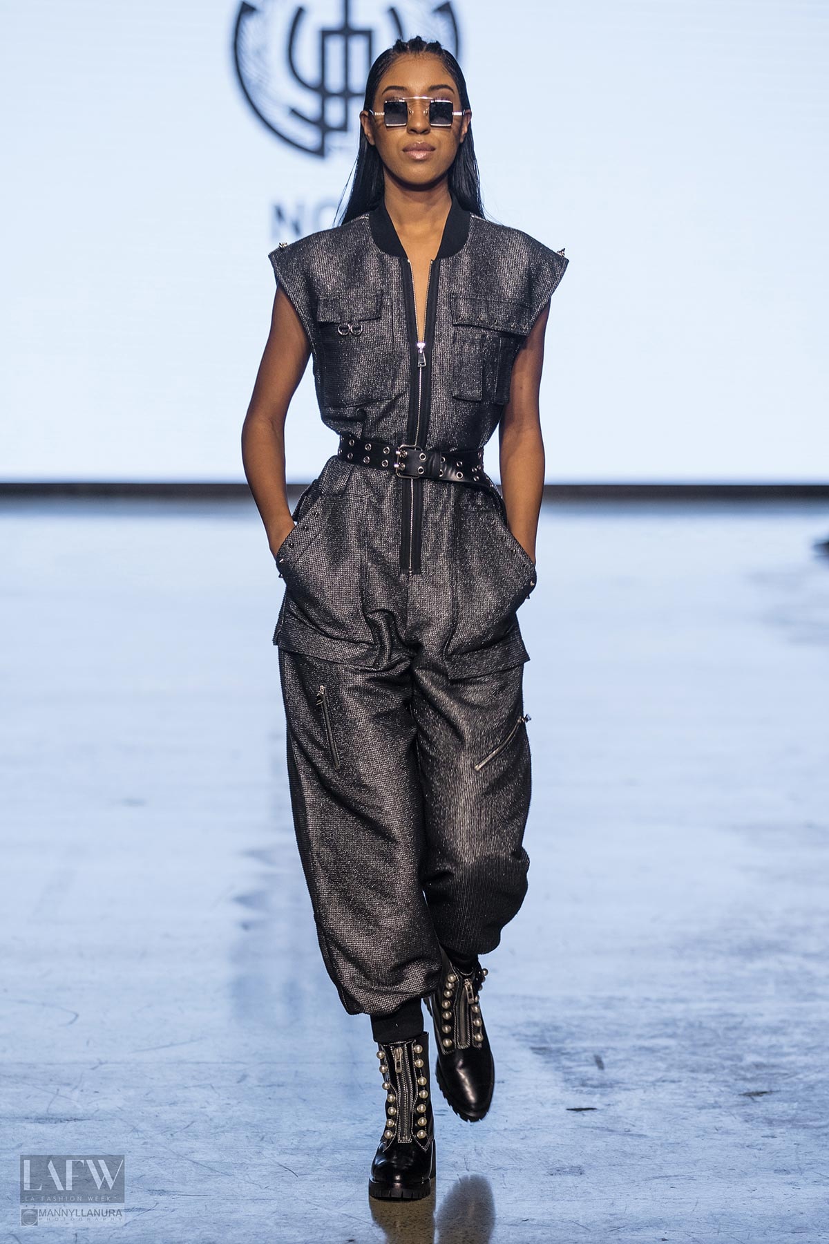 Chinese designer and actor Jane Wu leads the Los Angeles-based label, which is catered to the luxury market. The No. J’s latest collection showcased ready-to-wear separates, dresses, jumpsuits, suit pieces, outwear and more for both men and women that featured futuristic motifs, such as metallic threads, reflective materials, bold silhouettes and more. Key pieces include metallic coordinated looks, utilitarian jackets and pants, and leather zip pants.