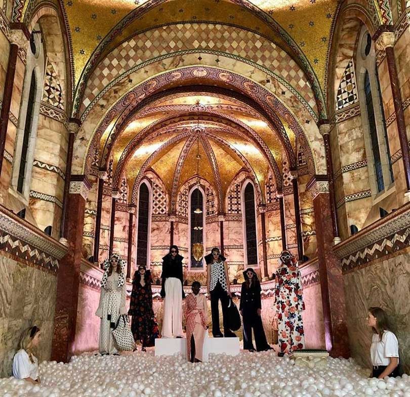 Mother of Pearl transformed the Fitzrovia Chapel into London’s most fashionable ball pit, with more than 300,000 pearl balls surrounding the models to represent the "plethora of microplastics that are deposited into the oceans each day from the washing of synthetic fibres”.