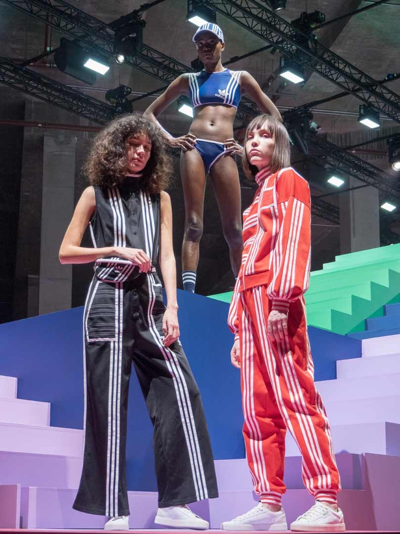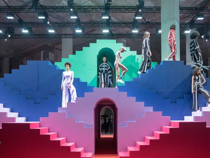 The impressive set design was inspired by the impossible staircase and featured models moving in continuous, choreographed loops throughout the structure, showcasing the sense of movement within the collection. Each layer of the structure referenced a different colour from the collection, which marks the third in a series of collaborations between Adidas Originals and emerging female designers who are reimagining iconic three stripes designs.