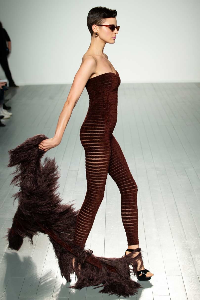 He sees knitwear as sculpture and each season he experiments with different volumes to create sensual silhouettes and for autumn/winter he offered a glamorous takes on Hollywood dressing with cocktail gowns with puff ball skirts and fringe detailing, as well as flowing capes with shredded feather-like qualities over seamless smooth bodycon jumpsuits that highlight his innovative knitwear and stitching techniques.