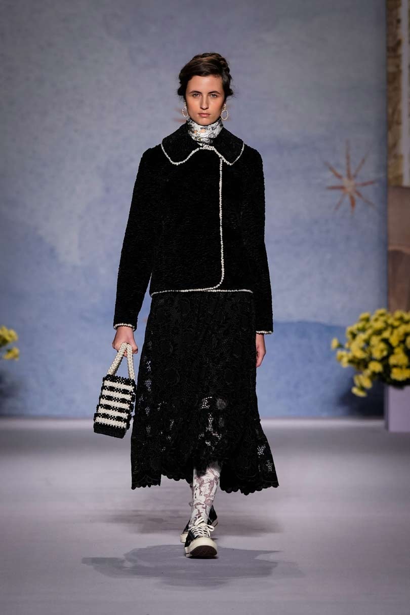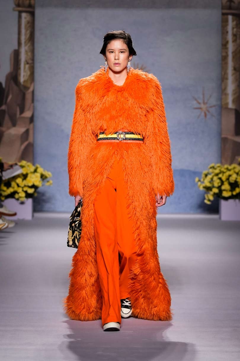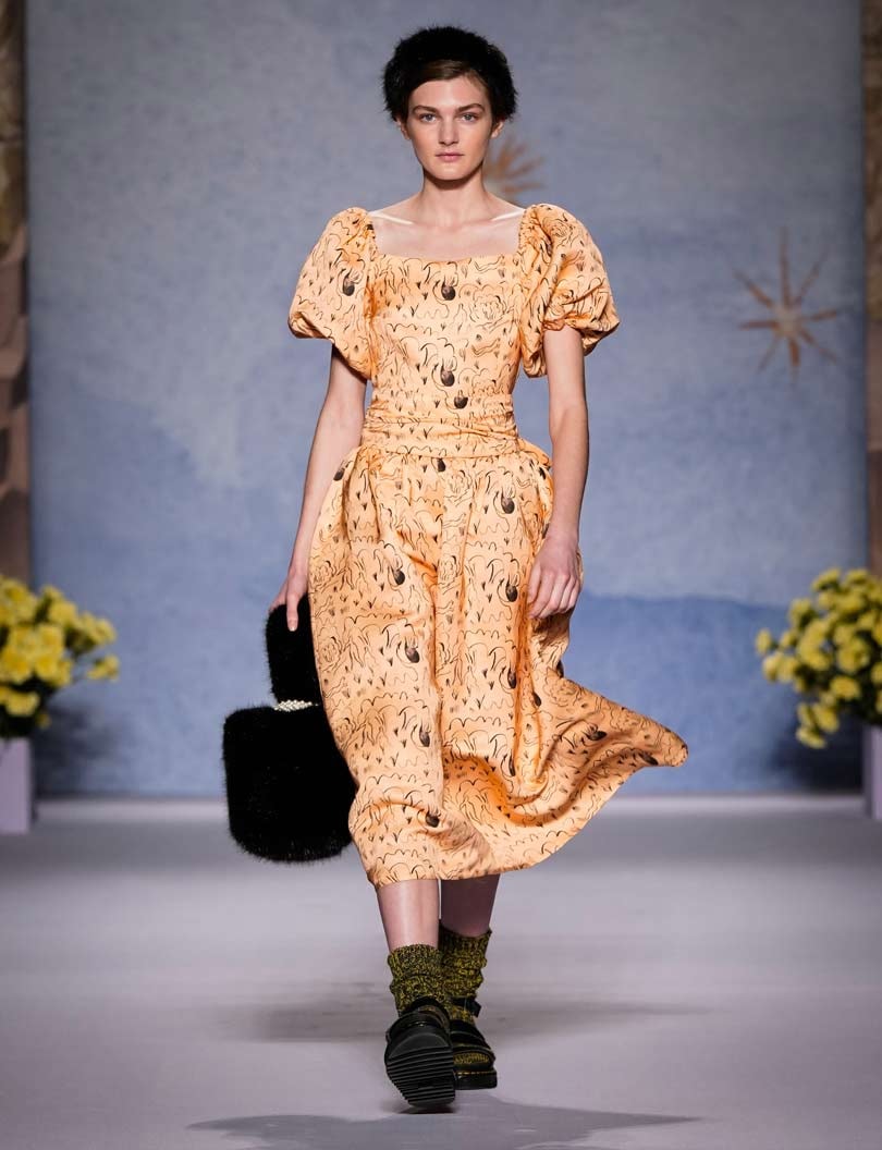 Shrimps first made its mark with its faux fur outerwear, leading the conversation on cruelty free fashion, and it was its bright yellow faux fur coat that was the standout, its dressing-gown style will surely be an instant sellout. Other key looks included a cape floor length apricot faux fur with tie detailing and knee length and cropped jackets with painting-like patterns swirled on, telling the stories of the gods and goddesses.