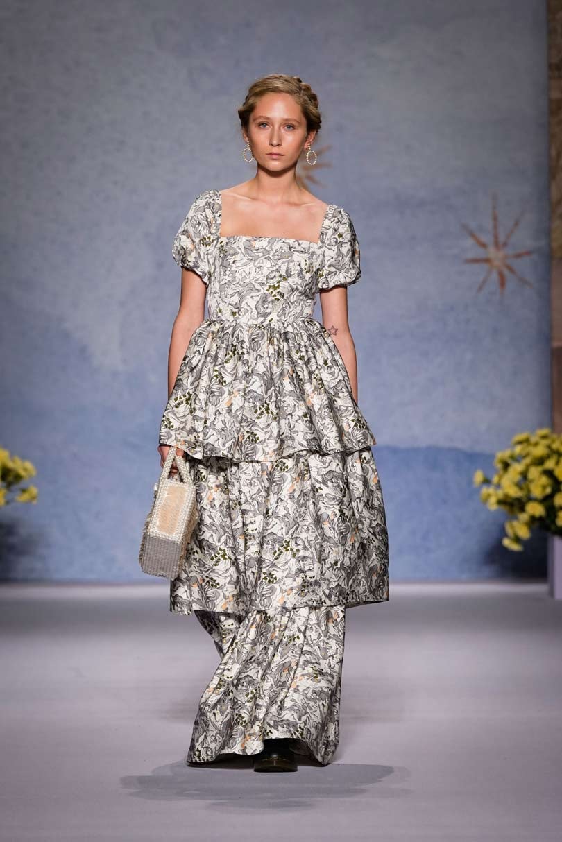 With a celestial backdrop painted by artist Ryan Driscoll, the Shrimps models, or better still goddesses glided down the catwalk in ethereal Grecian style dresses interpreting the world of Greek mythes in the collection’s prints, depicting the strength, femininity and power of goddesses like Gaea, Goddess of Earth, Amphitrite, Goddess of the Sea, and Venus, Goddess of Love.