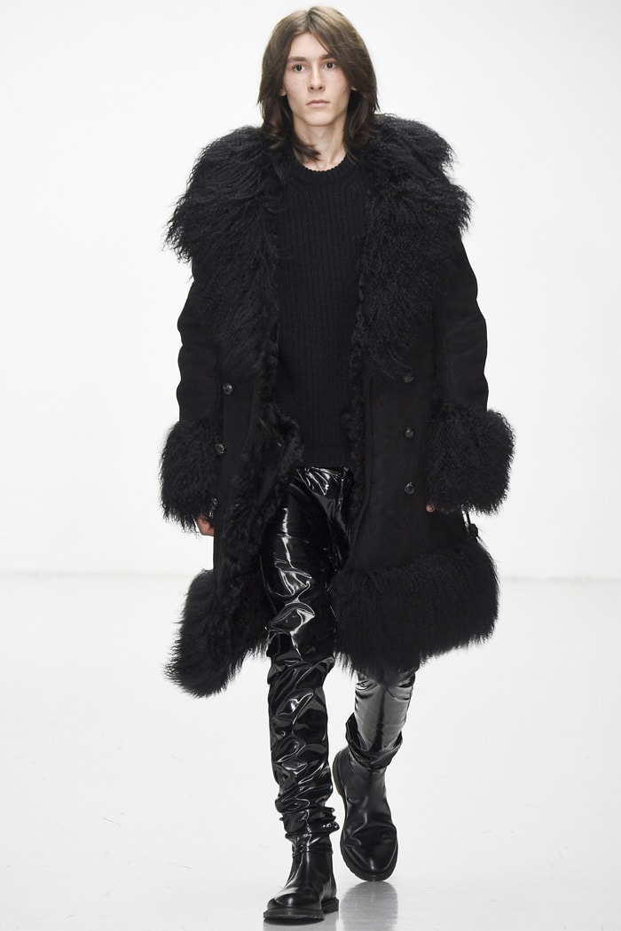 Christopher Kane decided to shun the catwalk and instead held a presentation buyers and press could visit throughout the day. There was plenty of silhouette in Kane's latest creation, mostly loose and cocooning, which was all about directional streetwear. T-shirts featured grids of high-visibility green, loose jeans in dark denim with asymmetrical turn-ups - some with shearling. Outerwear came trimmed with reflective fabric, while one parka appeared coated in aluminum. There were plenty of prints, like double-patterned shirts, lightning bolts on track suits, and intarsia suiting. Enough to keep the buyers happy to excite the rails at retail.