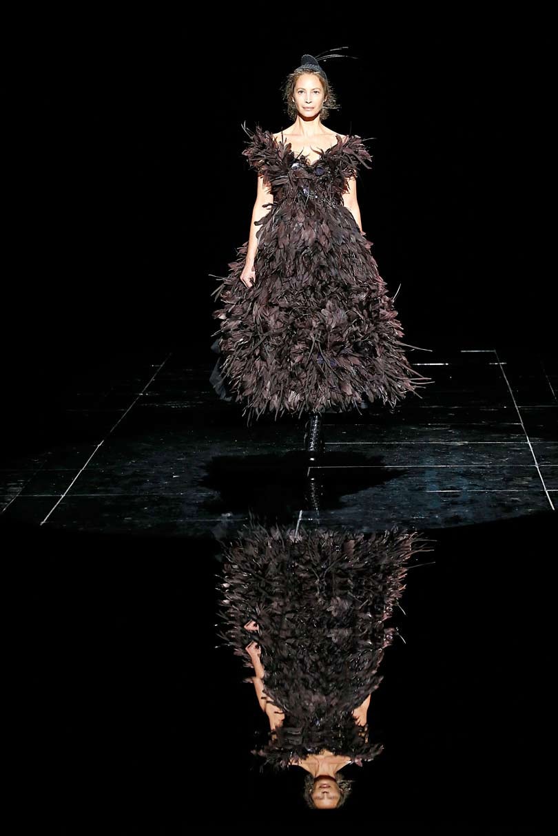 Held in a pitch-black Park Avenue Armory, the show was intimate with a single spotlight highlighting the first look on the catwalk, a leopard print coat shouldered over a pussy-bow blouse worn under a wide striped trouser suit. The outerwear stole the show in the first six looks, before an emerald turtle neck shift dress changed the tone. An exaggerated A-line silhouette dominated most propositions, but as they became more elegant and eleborate toward the end, the final look a feather black swan worn by Christy Turlington, they brought to mind the Marc Jacobs of yore, a master of New York Fashion Week.