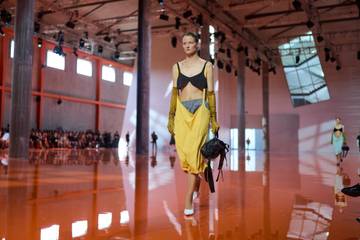 Prada's SS26 MFW show featured skirts fastened to suspenders that floated away from the body, paired with bras and a variety of layering choices.