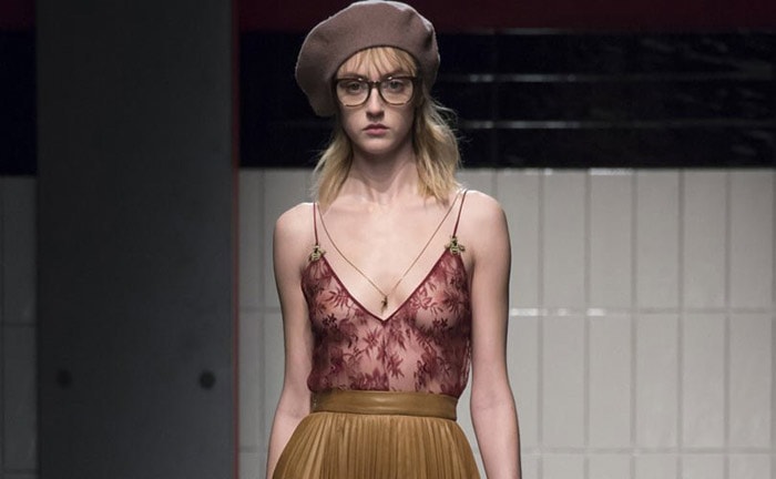 Instead of the sexy, vampish Gucci woman the industry has become accustomed too is now a girlish, geeky women with straight hair and a little makeup. "Sexuality is on the inside, it is a private matter," said Michele to the Telegraph after the show. His source of inspiration for the collection was most likely Magot Tenebaum, from the film 'The Royal Tenebaums' from Wes Anderson in 2001. There were coats, paired with flat shoes and chiffon blouses which very reminiscent of the character, although Michele did not go further into detailed on the matter.