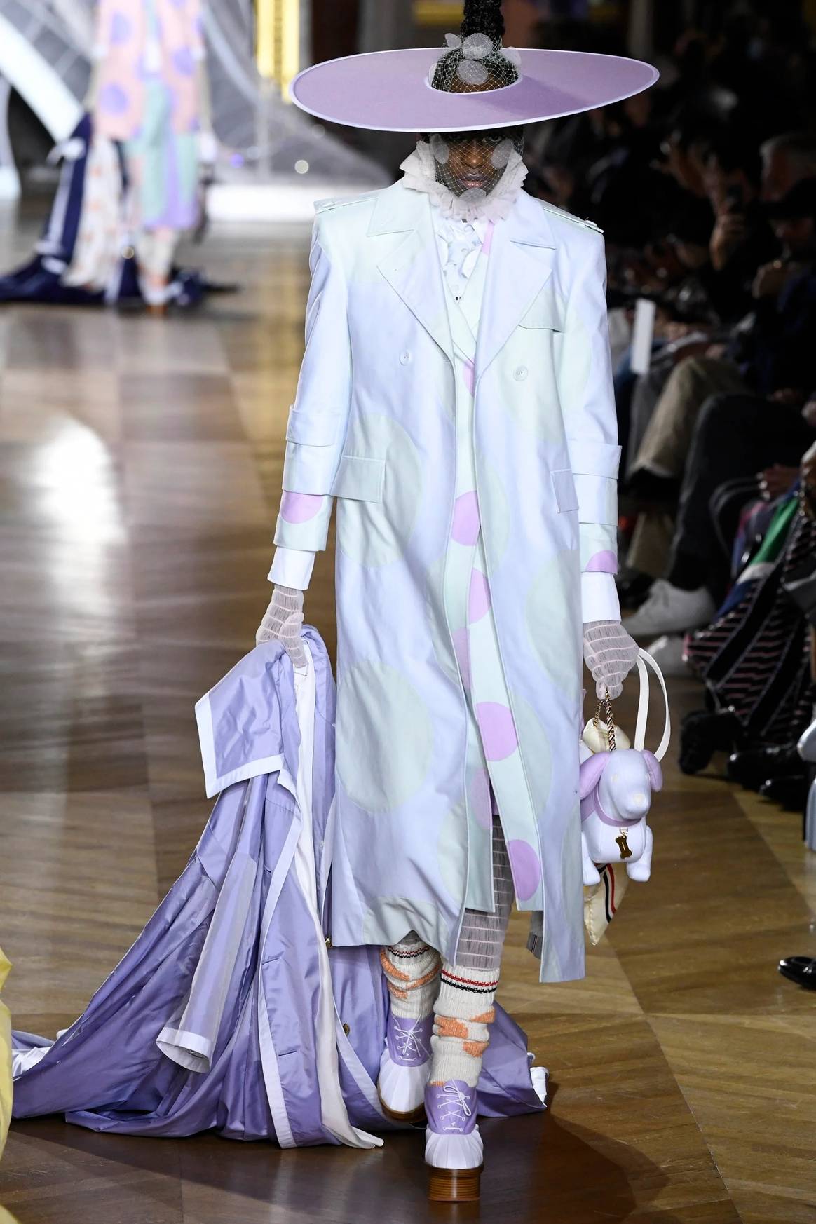 From Thom Browne “An American prom mixed with Cinderella mixed with the Paris Opera.” Among many looks in combinations of pale colors: a layered look in pink, lilac, blue and green was topped off with a broad brimmed picture hat.
