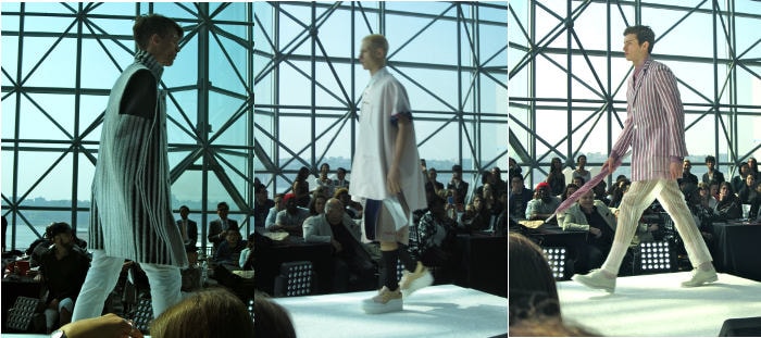 Generously layered tailoring ––sharp yet luxuriously oversize in the collection of Yao Yu, a former architect––in fifty shades of grey for both men and women, gently ushers in a series of dapper pastels for men. Particularly noteworthy are former Thom Browne intern, Jooyoung Kim’s, boating stripe blazers that recall Dick Van Dyke dancing with penguins in Mary Poppins.