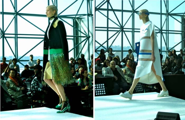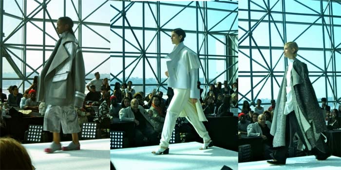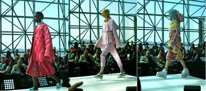 Lea Germano’s quietly manic medley of pinks stride by and the small scale prints recall those of your favorite pjs when it’s a “work from home day” but the concept is finessed with elbow to wrist flared pleats, bold jewelry from copper piping and heathered knits. All this coziness jars joyfully with our venue, a glass and metal hangar-like section of the Javits Center whose structure mimics the scaffolding that currently seems to support most of this city. Carmen Gama’s sturdy outerwear in neon orange and acid green epitomizes streetwear in that it’s inspired by the construction workers behind the city’s incessant drilling.