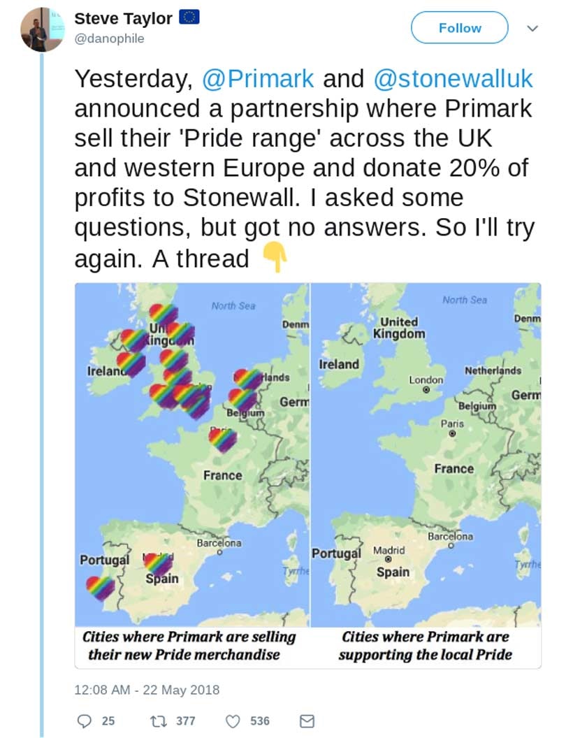 The UK Pride Organizers Network, which represents the charities that organize the more than 100 pride parades that happen in the UK each year, has issued a statement saying it is “disappointed” to see the proceeds from Primark’s Pride Collection being donated to Stonewall. “All Pride organisations are voluntary bodies that struggle every year to raise the funds necessary to hold these major public events, most of which are free to attend. In the last week, in one city where Primark will be selling these products, the Pride has announced it is scaling back its event due to a lack of funds. This is a daily reality for most Pride organisers. Stonewall has been critical of Prides in the past, and this is an insult to those Prides who sell their own merchandise to raise funds for their events”, they said.