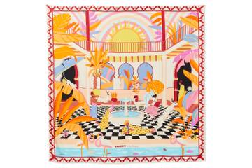 The capsule aims to capture Moroccan life and features bright illustrations from Barthélemy, inspired by Mohamed Ben Ali R’bati, considered the first modern painter of Morocco. These graphics come to life on silk shirts, T-shirts and scarves, polyester shorts and trousers, and two Kasbah bags, one of which is entirely hand-embroidered.