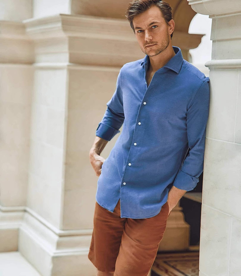 With an in-built charm and non ‘try-hard’ aesthetic, our oatmeal and navy blue silk-cashmere zip-up features alongside shirting with adaptability from day to night via the Midnight Blue Portofino linen shirt as well as Payne’s Grey and Striped Versilia shirt in the same fabric. For an easy style fix, customers can also try the Chambray Blue brushed cotton shirt.