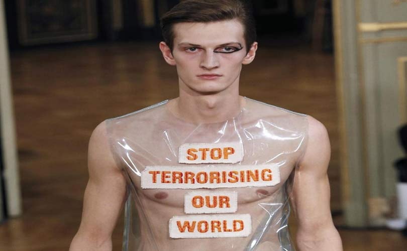 "Stop Terrorising Our World": the message sent down the catwalk on the first day of the Paris Fashion Week on Wednesday highlighted the lingering trauma in the French capital two weeks on from the terrorist attacks it suffered.