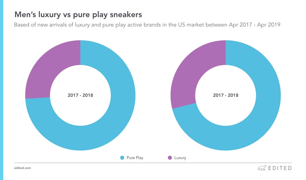 EDITED data confirms this market has experienced some impressive growth. The number of new men's luxury sneaker arrivals have increased quarter on quarter in the UK & US combined since 2016. While Q4 2018 reveals a dip from previous years, numbers shot up again in Q1 2019 by 26 percent - that’s 159 percent growth since Q1 2016.