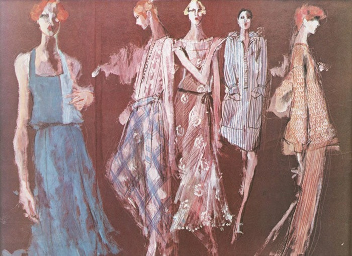 Hand drawing is beautiful if you are gifted that way, and your portfolio should feature it proudly. Go old school with a beautifully illustrated design that fills the page but for a couple of swatches pinned beside it. Check out the timeless compositions of fashion illustrators from the past like Kenneth Paul Block or René Gruau. Gaudy Photoshopped backgrounds for your illustrations are distracting and unnecessary, and a curse of some schools. They will not get you a design job or compensate for the fact that your designs are weak.