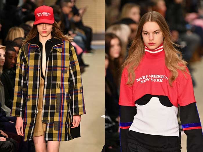There was no escaping the specter of Donald Trump, with America's cultural elite upset that Hillary Clinton, much admired in the fashion industry, lost the election and angry over the first chaotic weeks of his presidency. Public School parodied his "Make America Great Again" hats, Mara Hoffman opened with a manifesto from protest organizers and Nepal-raised Prabal Gurung sent models out in protest feminist T-shirts.
