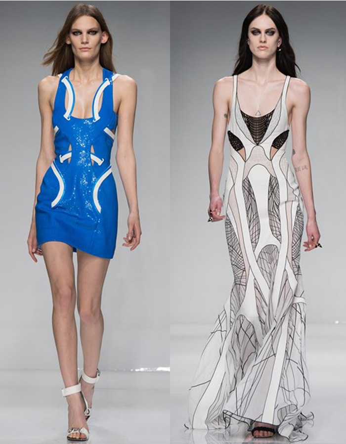 Donatella Versace presented a series of revealing strappy dresses and short sporty Formula One-influenced combinations that dared women to get into the fast lane.