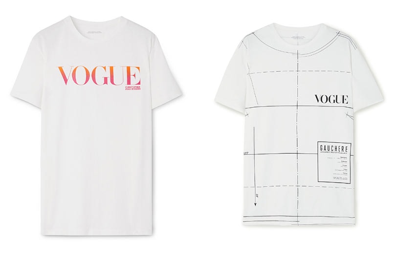 Vogue commissioned each designer to reimagine the official Vogue T-shirt, in line with their individual design ethos. New York-based Christopher John Rogers took his use of vibrant colour to give the Vogue masthead a new look in a pink and orange ombre effect, while Paris-based label Gauchere shared its minimalist aesthetic with a print featuring markings reminiscent of pattern templates, contemporary label Ioannes featured one of its Japanese-inspired prints, and handbag brand S.Joon highlighted its tulip sculptural shape bag design.