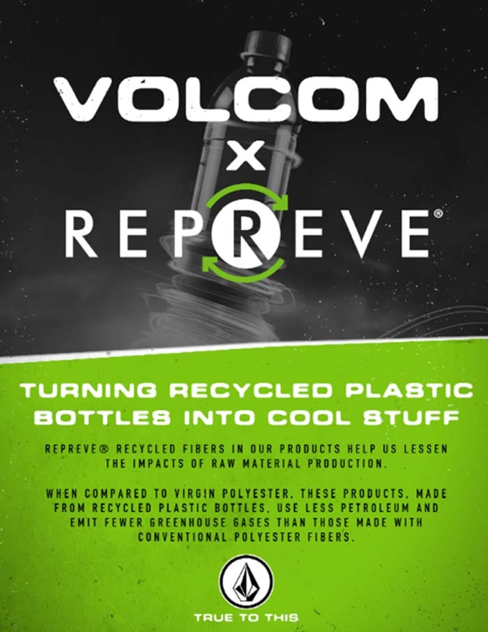 Approximately 5 plastic bottle are used now when producing a pair of Volvom Mod-Tech boardshorts. The recycled polyester needs half the amount of energy to be produce than that of virgin polyester and helps reduce greenhouse gas emissions during the production process by approximately 45 percent. In turn, this offsets the need to use new resources, such as petroleum while emitting fewer greenhouse gases.