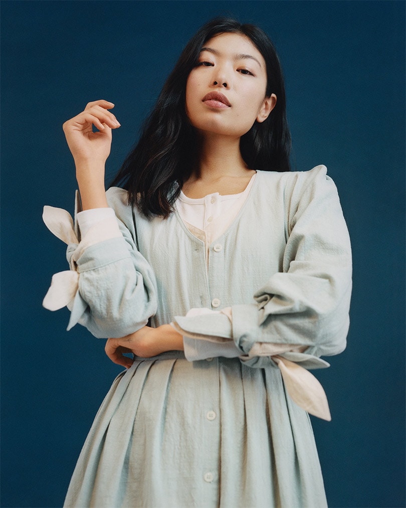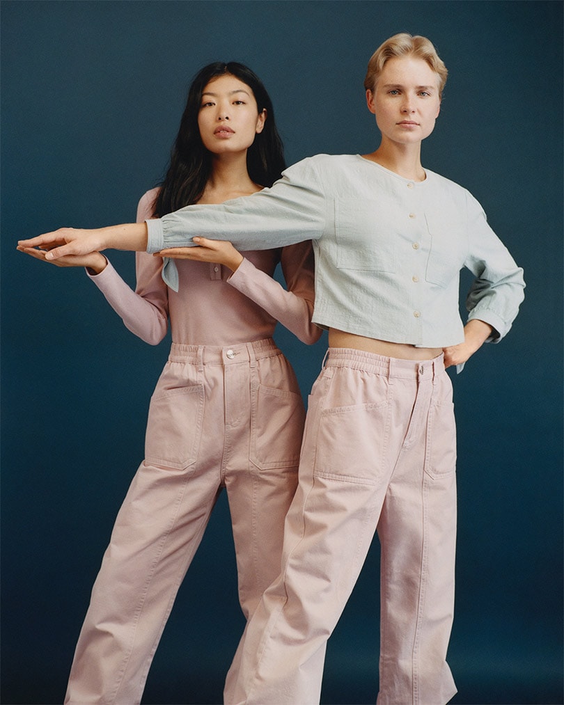 Highlights include the prairie-style ‘Orlando' button-front dress with tie sleeves that comes in ivory and blue, as well as the ‘Arthur’ jogger-style trousers in blush pink, and the relaxed ‘Jerome’ trousers in ivory.