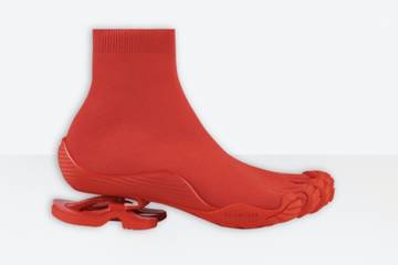 First revealed on the fall 2020-21 catwalk, the Balenciaga Toe collection is slowly making its way onto social channels and in stores. The unusual shoe combines Vibram’s design with a 5-finger toe and recycled knit sock and, depending on the model, preformed square heel or suspended sole. Each model of the limited edition bears the logos of both companies and is numbered. The color palette includes black and bright shades of pink and red.