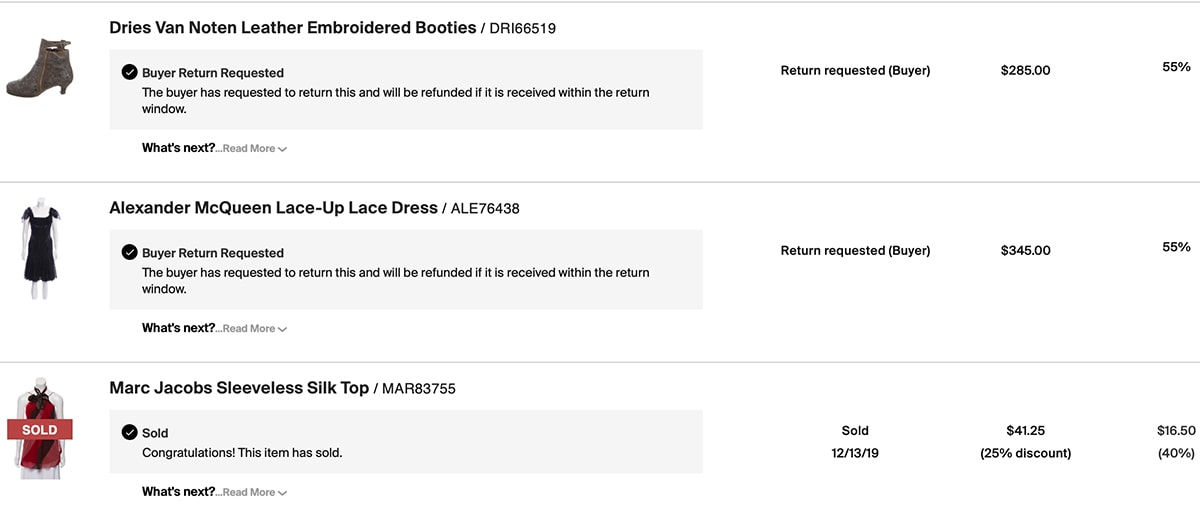 I am informed that The RealReal welcomes dialogue with consignors, and if necessary would take a second look at pricing, and it’s suggested that consignors reach out to their luxury manager. “Our consignment team are standing by ready to assist, and to see if there’s an opportunity there, even if the item has already sold, we would relook.” This is valuable information. The luxury managers are the representatives who make the initial at-home evaluation. But in my case any follow-up communications had been via automated messages from The RealReal Service, not from a personalized email, which made the prospect of contacting my luxury manager less likely.
