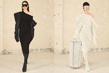 Draping is a recurring design feature. A long-sleeved linen dress has panels of rib jersey running down both sides, from cuff to hem. Some garments are voluminous with sudden cinching at the waist. Meanwhile, another linen dress hugs the body more tightly with fabric gaps to reveal the undergarment. The body is mostly covered, but there are moments of emergence, which is evidence of the experimental draping throughout the collection. Oversized and open- structure cable knits show the skin beneath, in either tops or skirts, followed by monochromatic looks which mirror each other: a long-sleeve white dress in a fine and supple leather, buttoned from rollneck to hem with open extended cuffs; a black sleeveless gown in viscose with a hidden internal construction. Silk jackets in black or white are lightly padded and effortlessly oversized.