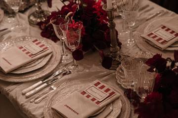 The evening began with a candlelit dinner in the hotel’s storied Bungalow where guests gathered around two dramatically long tables layered in soft ivory linens with antique candelabras and cascades of pearls reflecting off lush greenery just outside.