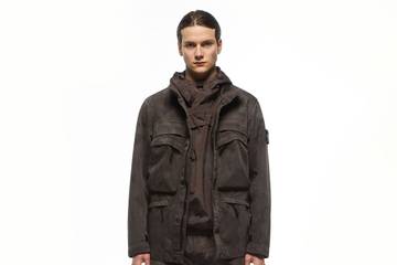 LIGHT LEATHER ORGANZA – A new fabric created from a super thin layer of sheepskin leather that is bonded to superlight polyester organza. The organza gives strength to the thin layer of leather, as well as a crunchy finish. The parka takes inspiration from vintage military pieces and motorcycling jackets, with internal seam-taping and covered zips, as well as the Stone Island internal rope system to attach liners for layering.