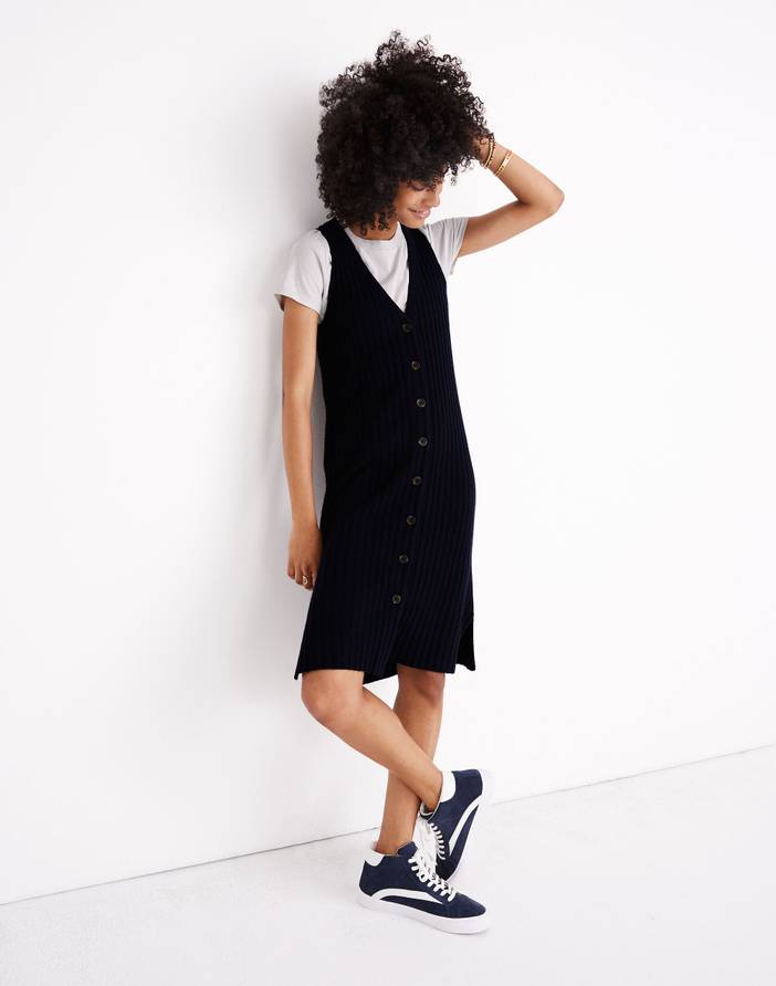 Ready for fall, this tank-style ribbed sweater dress has buttons all down the front. Layer it over a tee or turtleneck, add loafers and presto—you're that cool elementary school teacher everyone secretly has a crush on. Nonwaisted.Falls 40 7/8" from high point of shoulder.Viscose/nylon/wool/alpaca.Dry clean.Import.Madewell.com only.