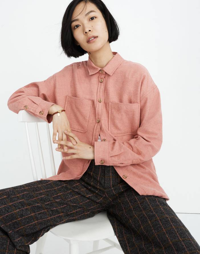 Made of the softest flannel in all the land, this oversized shirt jacket has patch pockets (and major '70s vibes). Perfect for layering, it's especially good over high-risers and a turtleneck. Oversized fit.Body length: 26".Cotton.Machine wash.Import.