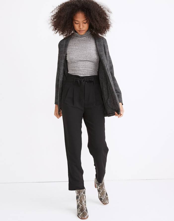 Crafted from luxe (and sustainable) satin-backed crepe, these tapered pants are the ultimate dress-up style. The pleated paper-bag waist is made to pair with a tucked-in tee or tank. 12 1/2" high rise, easy through hip and thigh, 14 1/2" relaxed leg opening, 23" cropped inseam.Do Well: For each pair made at the Fair Trade Certified™ Sterling factory, we contribute to a Community Development Fund managed by the workers.100% poly.Machine wash.Import.5'4" and below? Try our petite inseam; 5'9"-5'11"? Choose Tall.Madewell.com only.