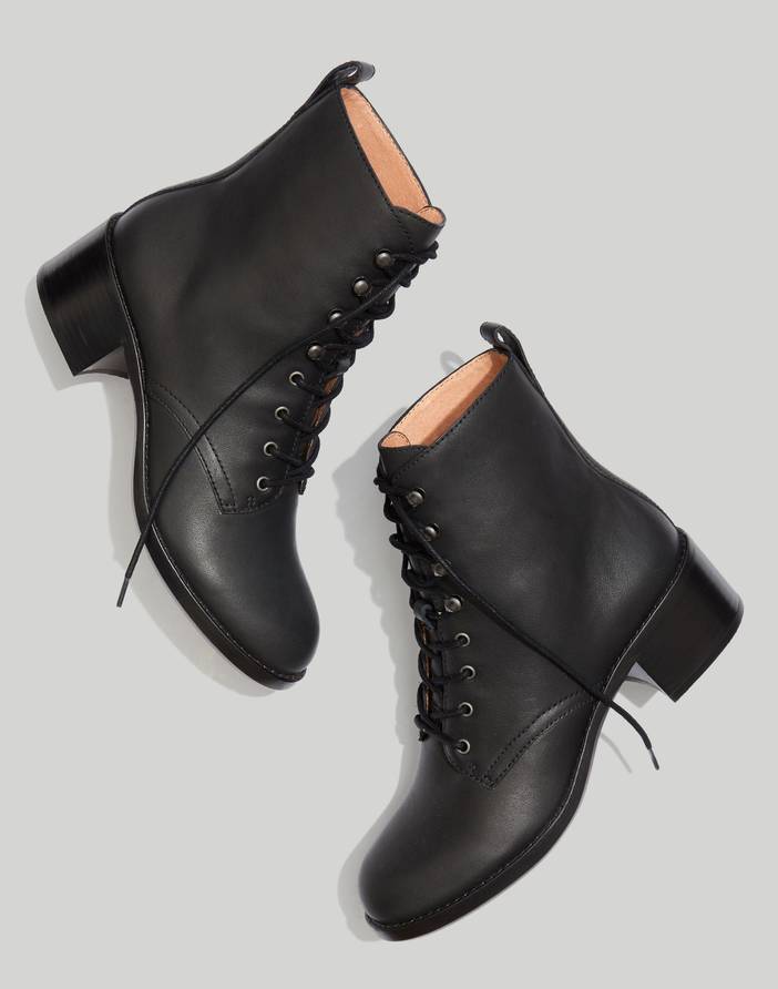 You asked, we delivered: meet our new leather lace-up combat boots, with a refined shape we love and some height at the heel. Sexy and a little edgy, this versatile pair goes with everything—from cropped wide-legs to every length dress. And, cushiness alert: our MWL Cloudlift Lite padding feels like walking on a...well, you know.When you select your size, "H" equals a half size.5 1/4" shaft height (based on size 7).2" heel.Leather upper.Man-made sole.Import.Select stores.Do Well: all leather, including some reclaimed from what would otherwise be waste, was sourced from a tannery that achieved a Gold Rating from the Leather Working Group (LWG), an organization that works to promote sustainable environmental practices in the leather industry.Imported.Madewell.com only.