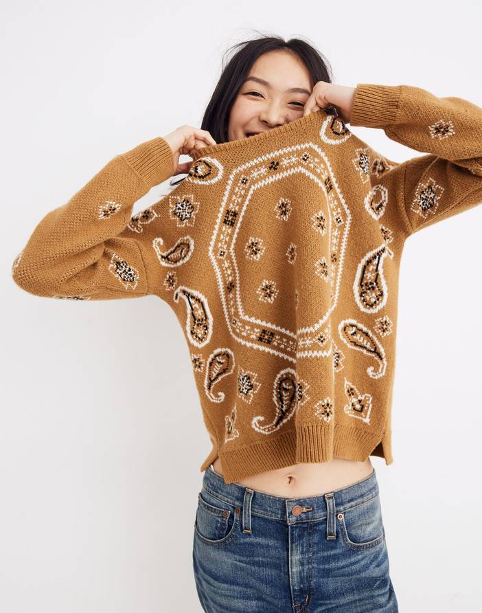 A classic crewneck sweater with an old-school bandana pattern? We're in love. Regular fit.Body length: 22 1/2".Cotton/viscose/nylon.Hand wash.Import.