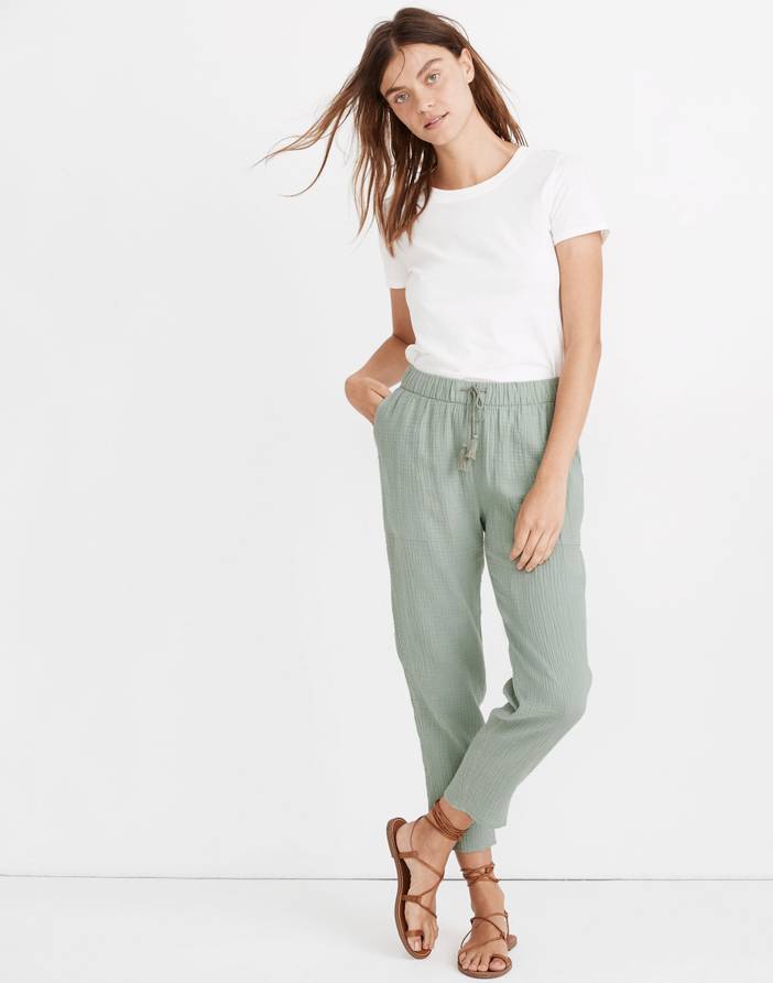 A beach-ready version of our signature track trousers, these pull-on pants come in breezy crinkle gauze. Cotton.Our swimsuits are machine washable, but we recommend hand washing as it helps keep the fabric and the shape of the suit looking newer, longer.Import.Madewell.com only.