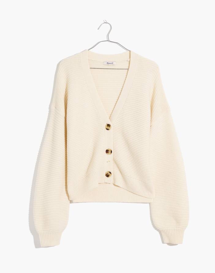 In a wide garter stitch (that's knitting-speak for those cool textured stripes), this boxy cropped cardigan sweater with balloon sleeves looks great over a fitted turtleneck. Doesn't get much cozier. Slightly cropped fit.Body length: 21 1/2".Wool/nylon.Dry clean.Import.Madewell.com only.