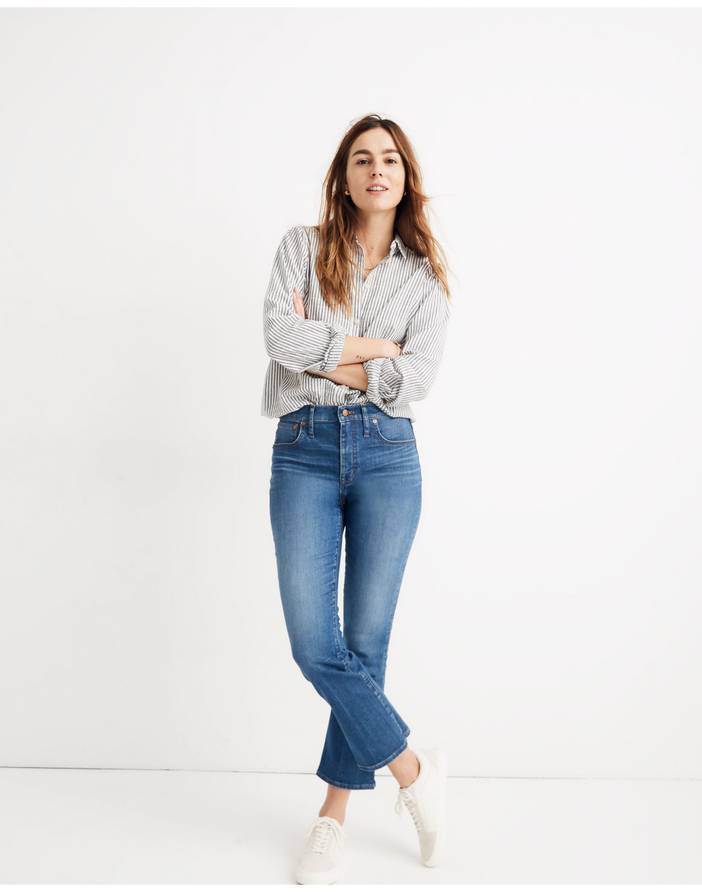 Meet our Eco Collection (!). The fabric: organic cotton denim from Candiani, sustainably dyed using shrimp shells (the upshot—it requires 65% less chemicals and 75% less H2O than conventional material). The factory: Fair Trade Certified™ Saitex, which recycles 98% of its water and uses renewable energy (plus, for each product manufactured, Madewell contributes to a Community Development Fund managed by the workers). The fit: Lean and modern, this pair kicks out to a mini-flare. Fitted through hip and thigh with a flare leg.Front rise: 9 1/2"; inseam: 26"; leg opening for size 25: 16 1/2".Premium 92% organic cotton/6% poly/2% elastane denim from Italy's renowned Candiani mill.Machine wash.Import.5'4" and below? Try our petite inseam; 5'9"-5'11"? Choose Tall.