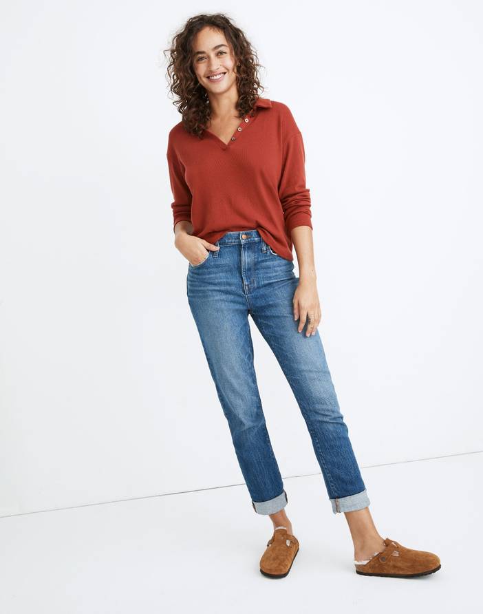 Easy in the (high) waist, our signature boyfriend fit has a slim-but-still-relaxed leg. Think a vintage men's jean cut to flatter you—made of denim with a touch of stretch for comfort. Styling tip: Buy your true size for a slouchy, easy feel or size down for a more fitted look.10 3/4" high rise, fitted through hip and thigh, 13" straight leg opening, 27 1/2" inseam.Do Well: For each pair made at the Fair Trade Certified™ Saitex factory, we contribute to a Community Development Fund managed by the workers.99% cotton/1% spandex comfort stretch denim.Machine wash.Import.5'4" and below? Try our petite inseam; 5'9"-5'11"? Choose Tall.Madewell.com only.