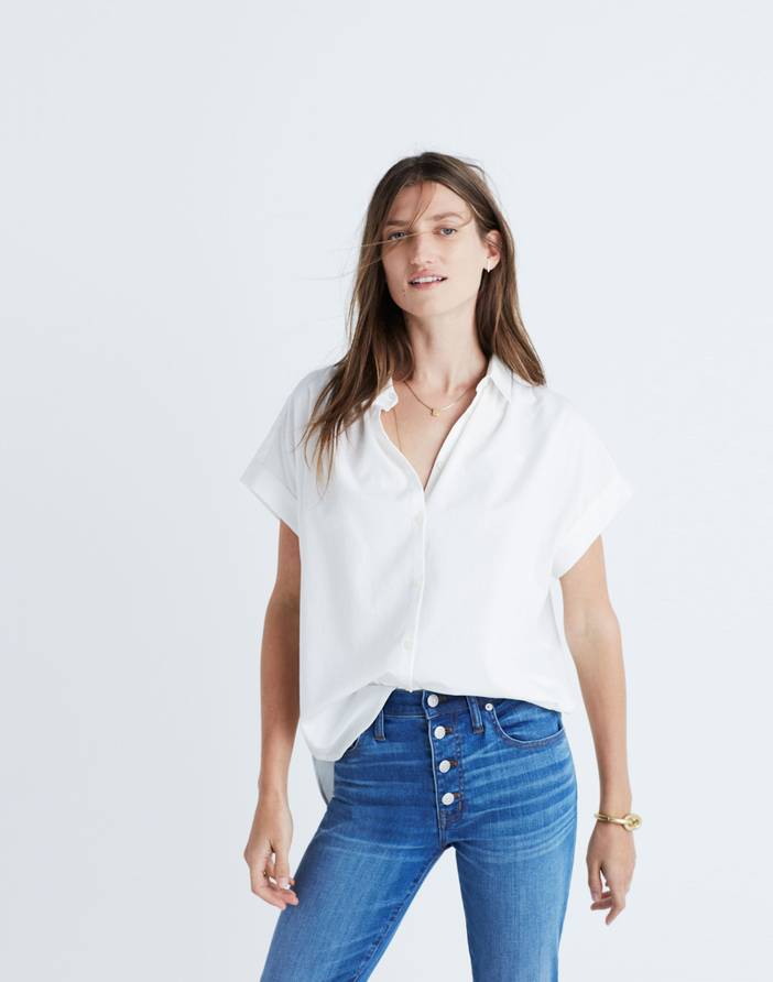 Effortless and cool with a soft silhouette and easy open sleeves, this is our feminine take on a slightly oversized shirt. Oversized, size down for regular fit.Body length from high point of shoulder: 27 1/2".Do Well: TENCEL™ modal fibers are derived from sustainable wood sources using renewable energy.Cotton/TENCEL™ modal rayon.Machine wash.Import.